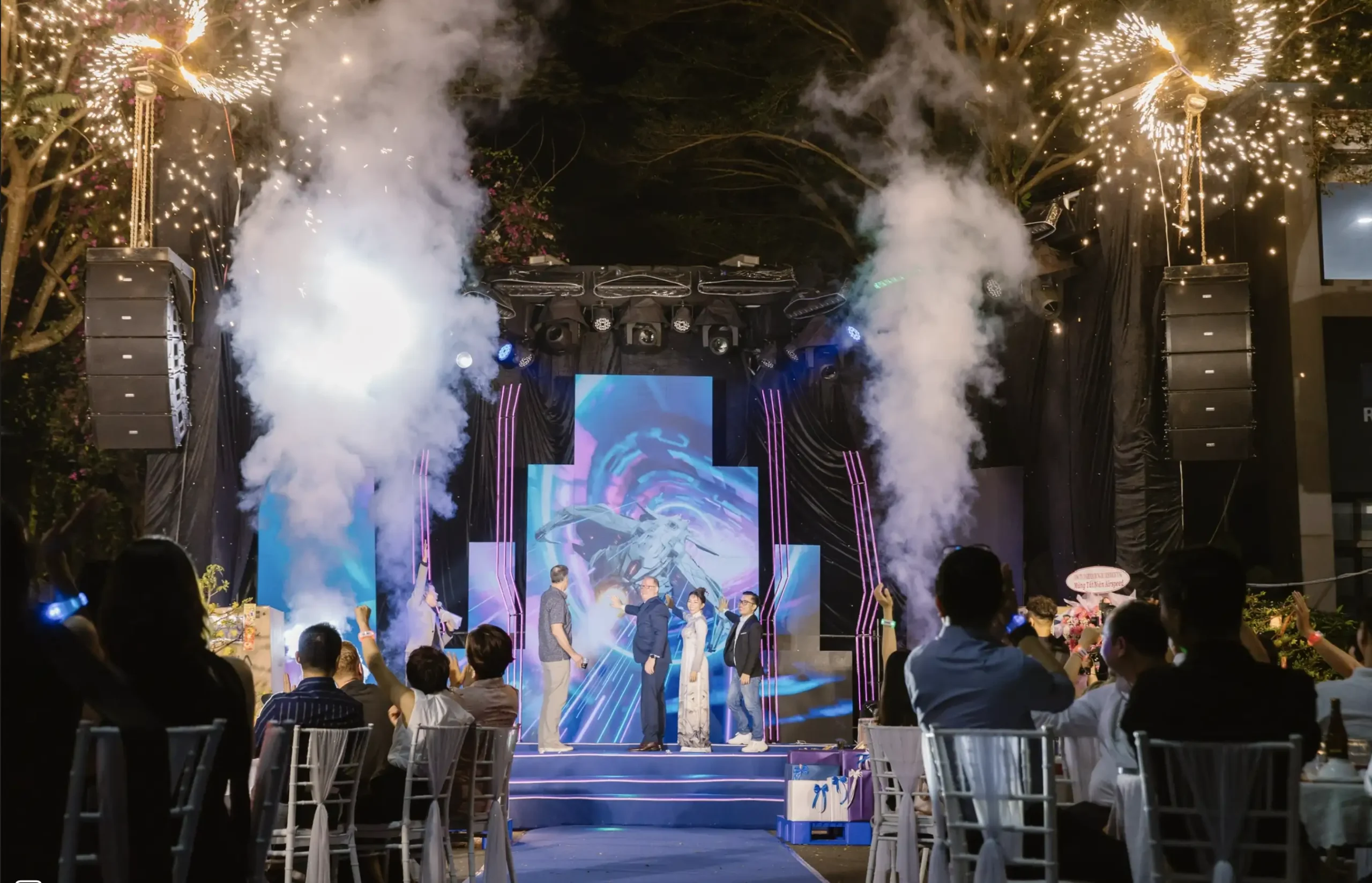 Tổ chức tại hội trường lớn, concept “Tỏa sáng cùng hành trình mới”, sử dụng dải LED sân khấu cong, backdrop sống động, lồng ghép video tri ân nhân sự và các tiết mục nội bộ xúc động. -